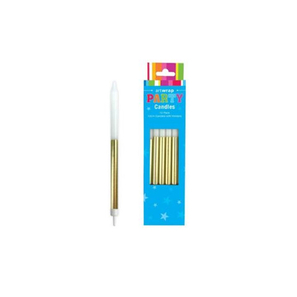 12 Pack of 12cm Candles with Holders. Half Dip – Gold.