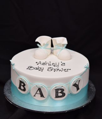Icing dots on a textured buttercream covered cake. This one has a cute icing baby bottom and feet under a blanket. Colours can be changed.