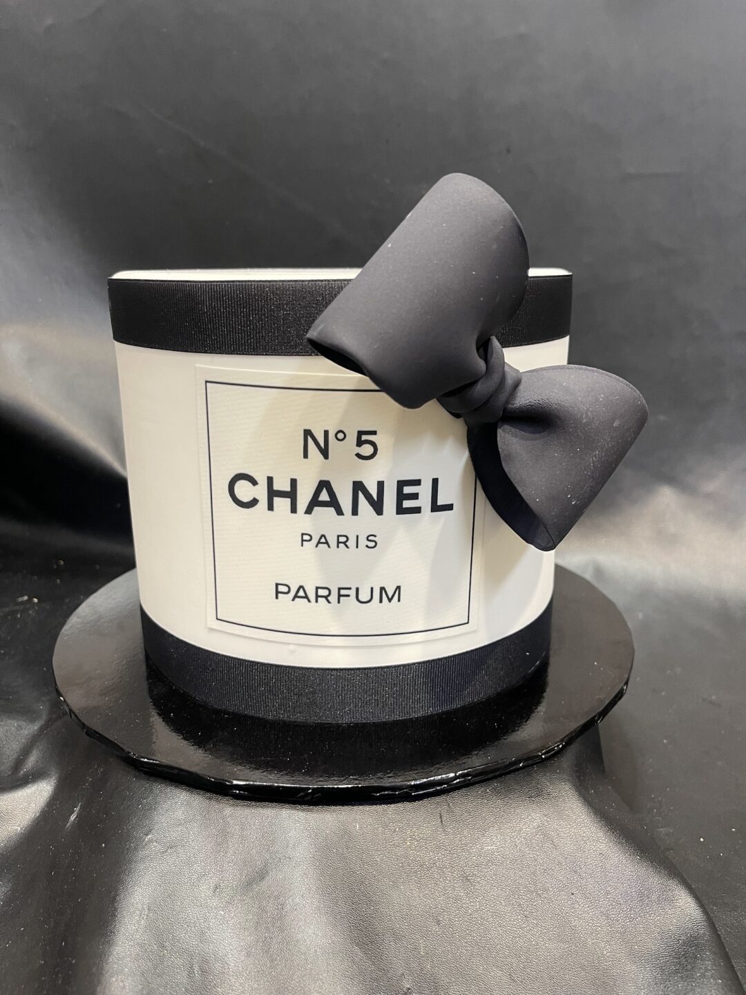 Edible Image Chanel Logo, on fondant cake with black icing bow and black satin ribbons. No. 5 can be customised to match birthday age – please comment in order notes at checkout. Chanel No 5 is default. Writing will be on the cake board in front of the cake.