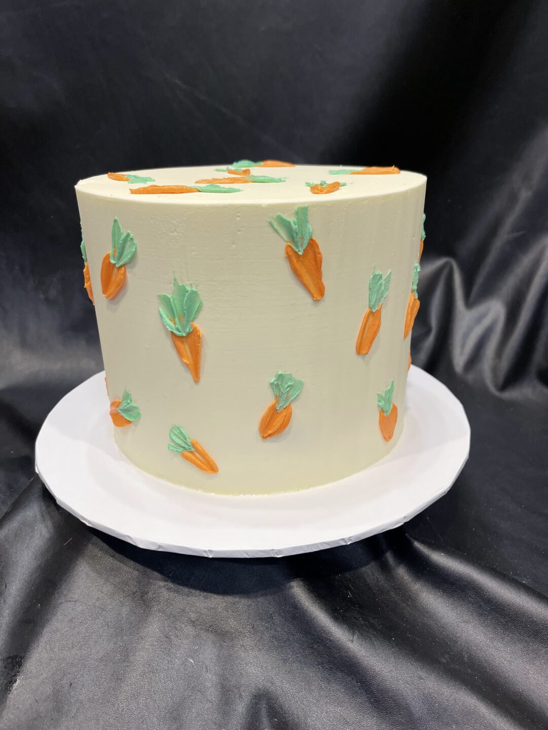 Smooth buttercream finish with hand-paletted buttercream carrot decorations.