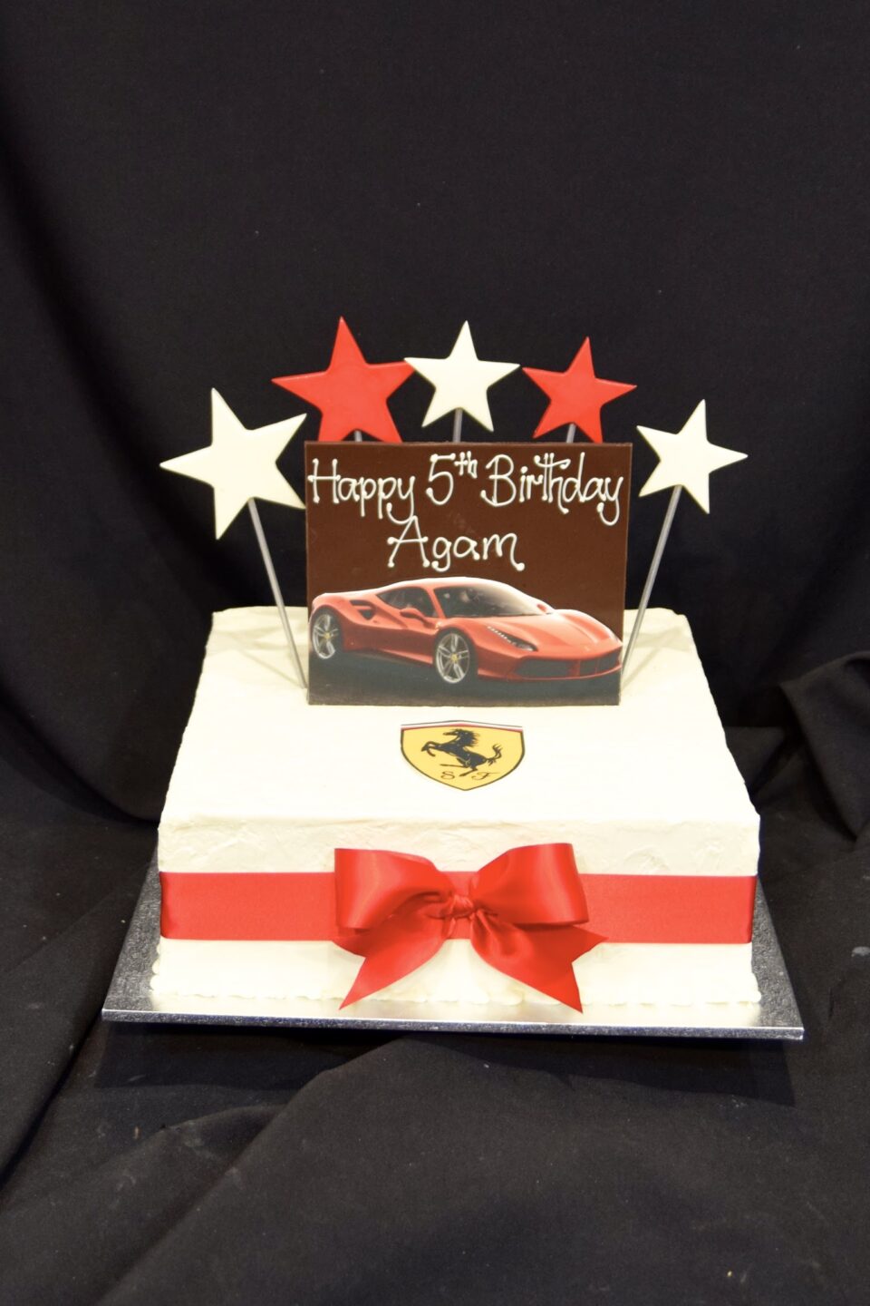 Textured buttercream finish with printed edible image of car on chocolate shard with message and 5 stars. Edible image car badge flat on cake. Matching ribbon and bow. Please upload car image and logo/badge image