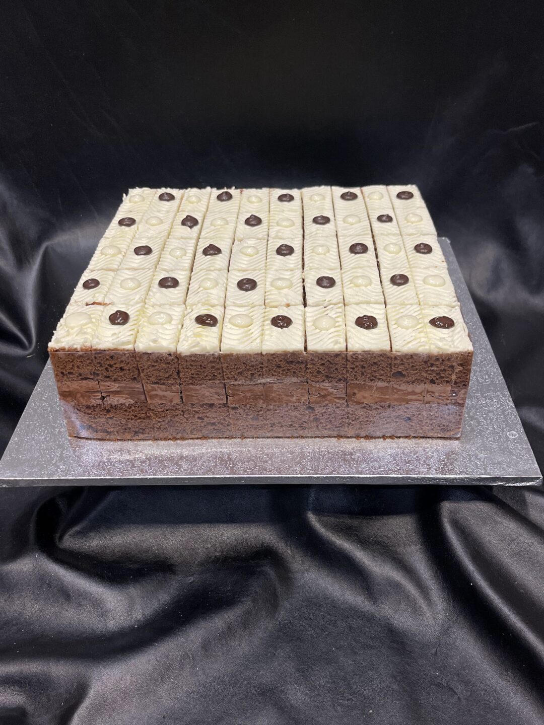 Need something simple, delicious and ready to serve? Introducing the Catering Slab: pre-sliced 10″ square (50 coffee serves) with 2 layers of cake and one layer of filling. Each cocktail/coffee portion has a garnish and the whole cake is wrapped in acetate to prevent drying out. $100 for the slab – that’s only $2 per serve!