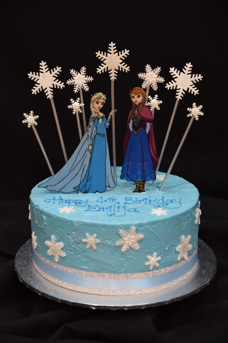 Textured blue buttercream cake with Anna and Elsa hand-drawn chocolate picture toppers and white icing snowflakes.