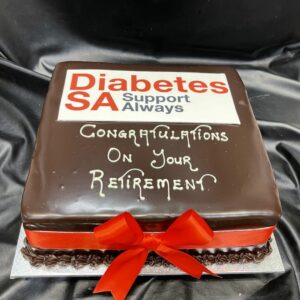 Cake covered in Dark Chocolate Ganache, edible logo image flat on top and chocolate message. Ribbon will be chosen to match the logo.