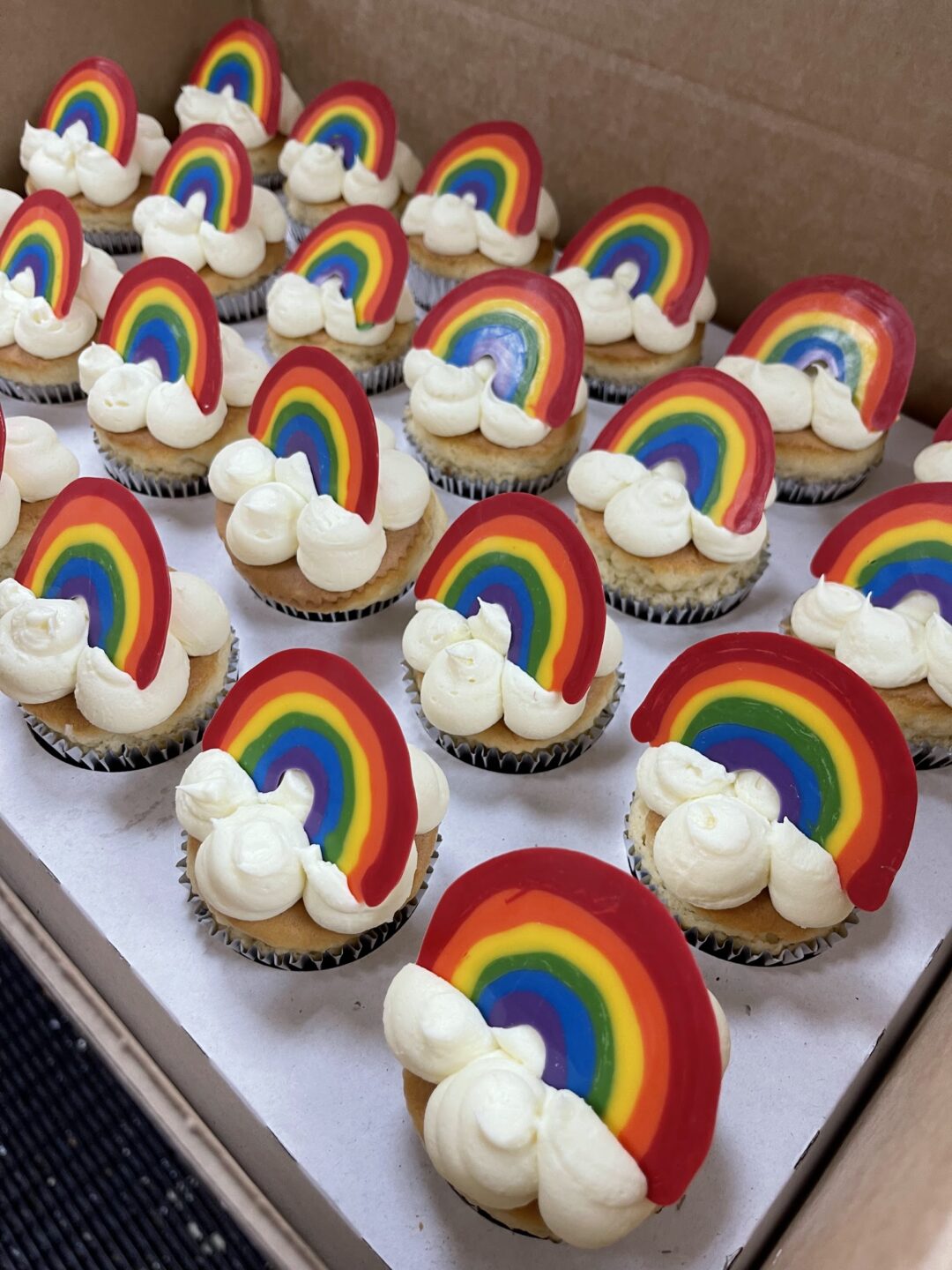 Vanilla or chocolate cupcakes with whipped white ganache clouds and hand-drawn chocolate rainbows.