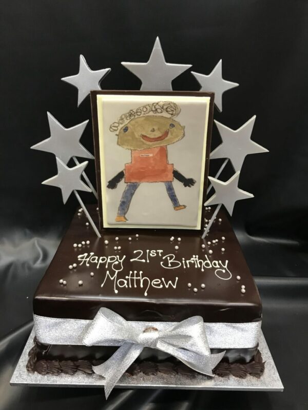 Dark Ganache finish decorated with an edible image of your choice on a chocolate shard with Silver stars and ribbon. Single colour – Silver – can be changed – please comment in Order Notes at Checkout. Upload your custom image below (image will be printed as is – we cannot photoshop)