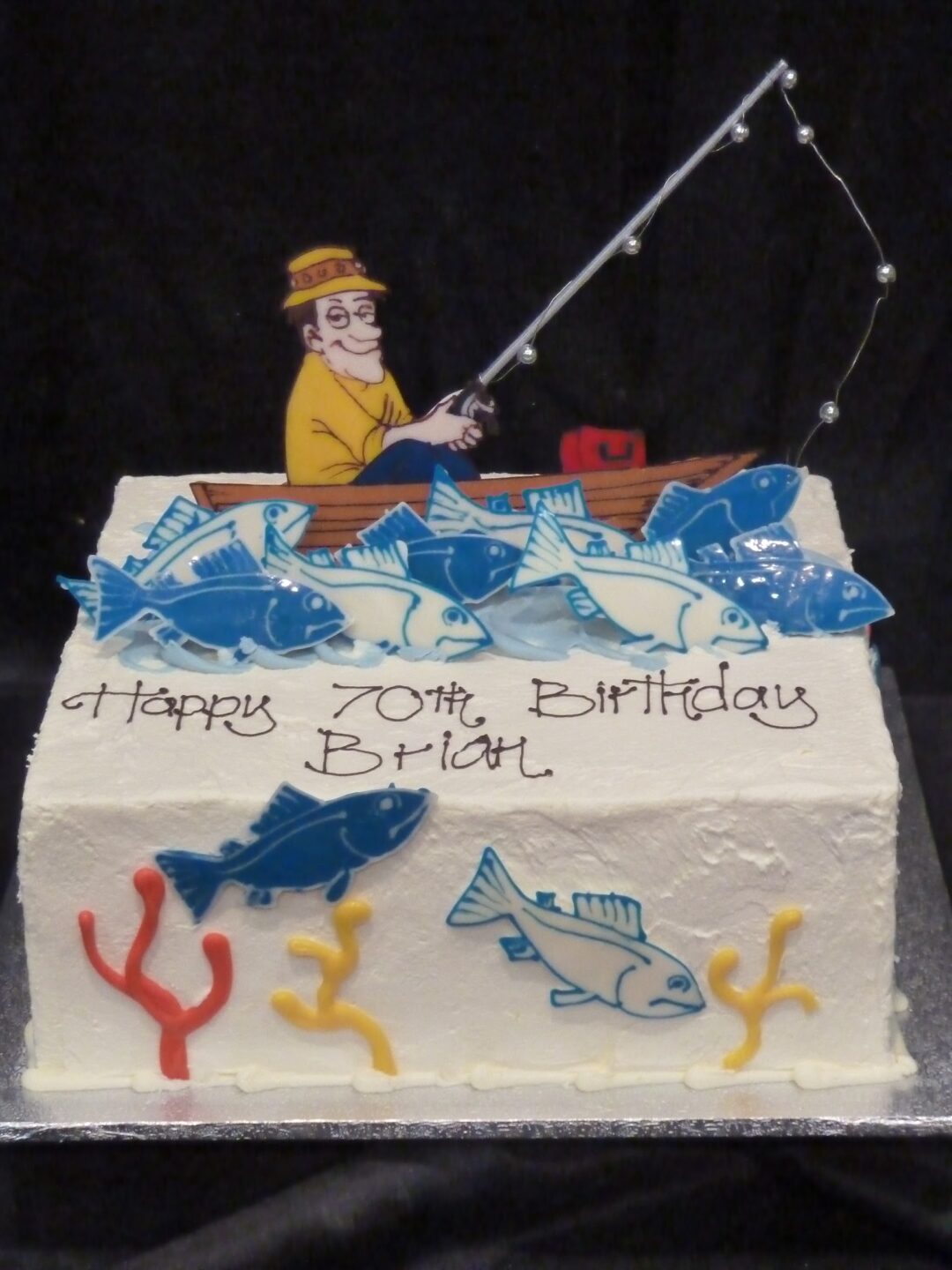 Hand-drawn chocolate picture fisherman in boat, with chocoalte picture blue and white fish and coral/seaweed on textured buttercream cake.