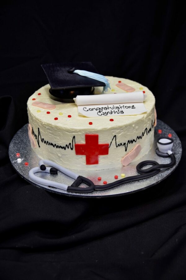 Textured buttercream finish with fondant icing decorations: mortar board cap, scroll, bandaids, and stethoscope. Hand-drawn chocolate heartbeat ECG around the cake.