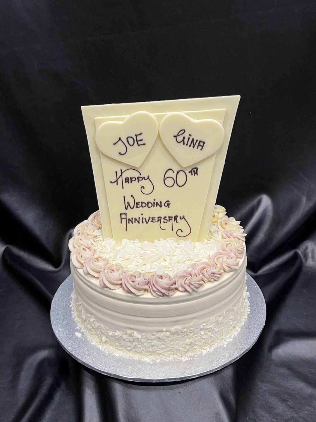White chocolate hearts with names on double white chocolate shard standing up on standard finish cake. Standard Vanilla Raspberry cake pictured. Decoration will match Standard Finish of the flavour you choose.