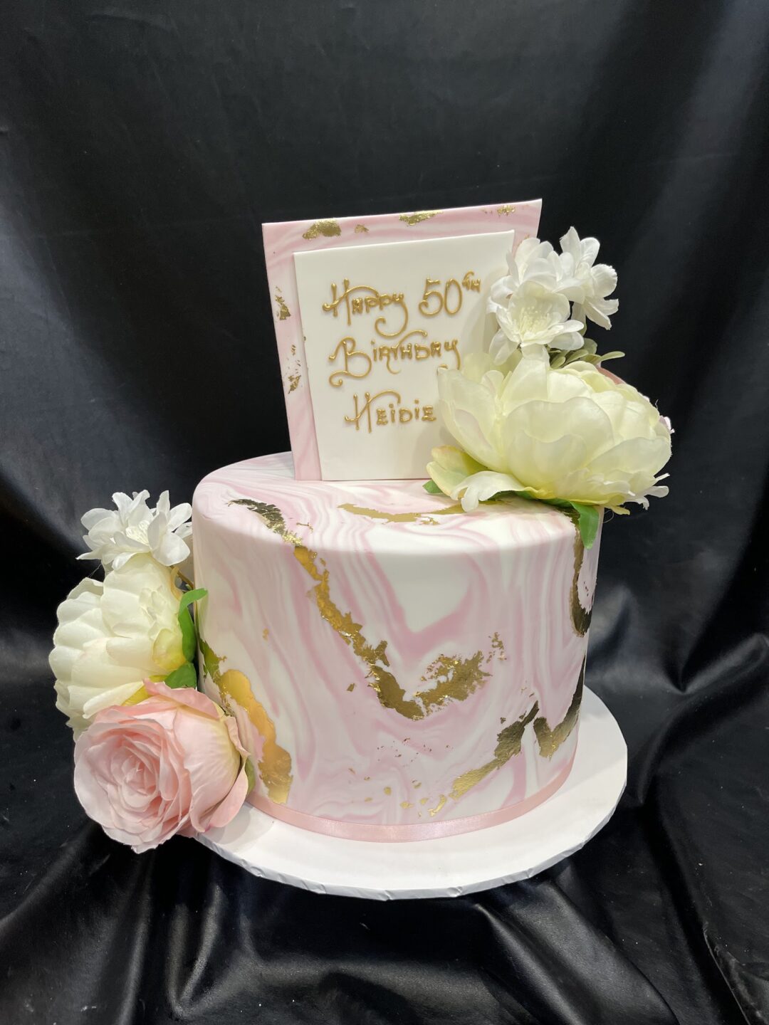 Pink Marble Icing with Gold Leaf and Silk Flowers