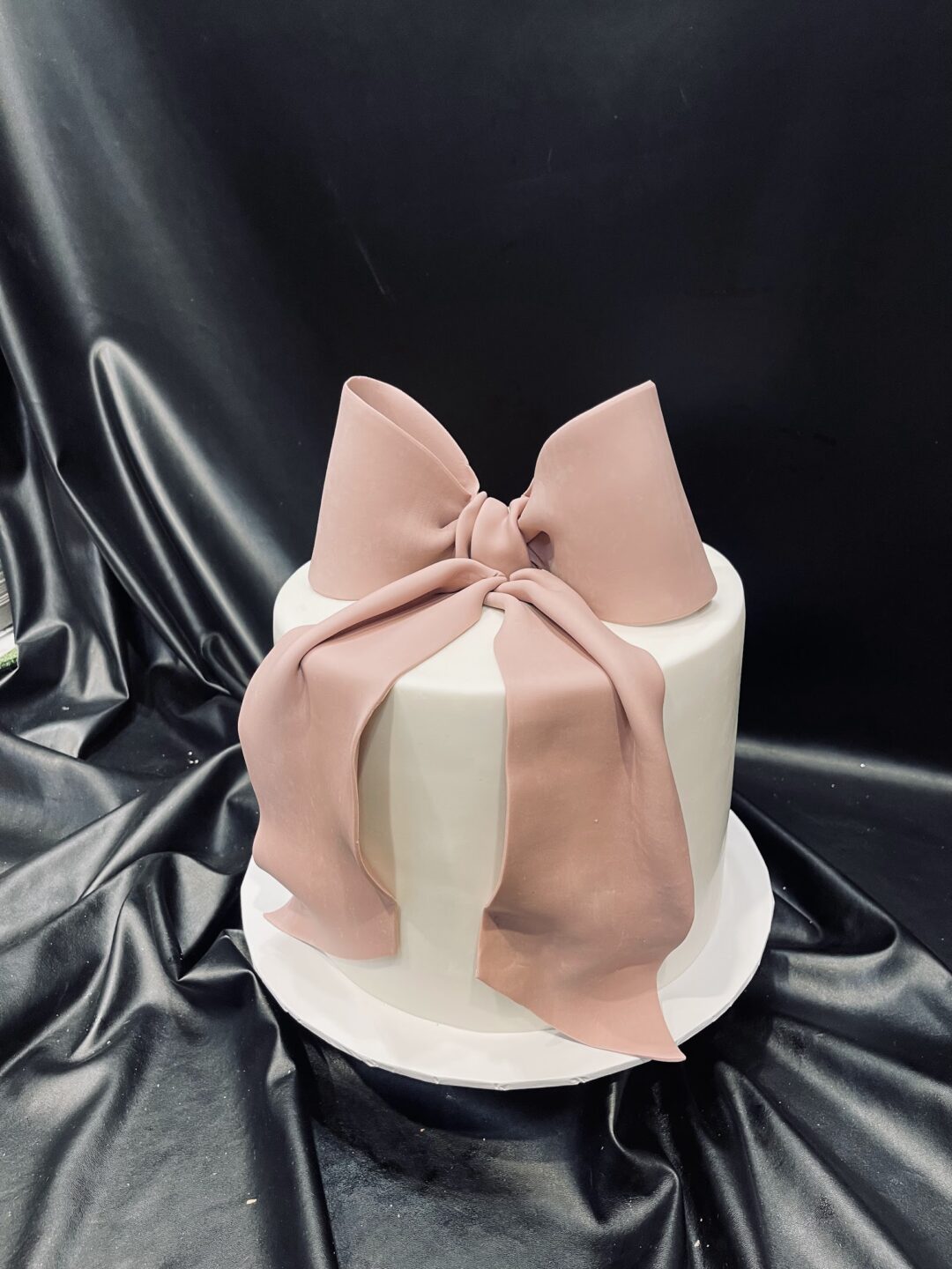 Fondant iced cake, single tier, extended height, with oversized fondant bow and tails. Dusty pink fondant bow colour can be changed – please comment in Order Notes at Checkout