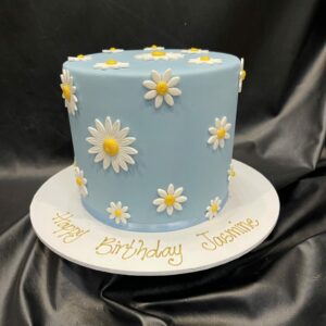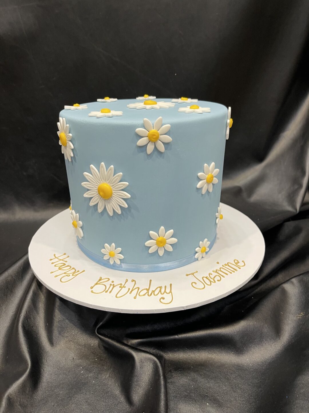 Extended height cake covered with pastel pink icing and fondant daisies. Pastel pink colour can be changed (no metallics), please comment at checkout.
