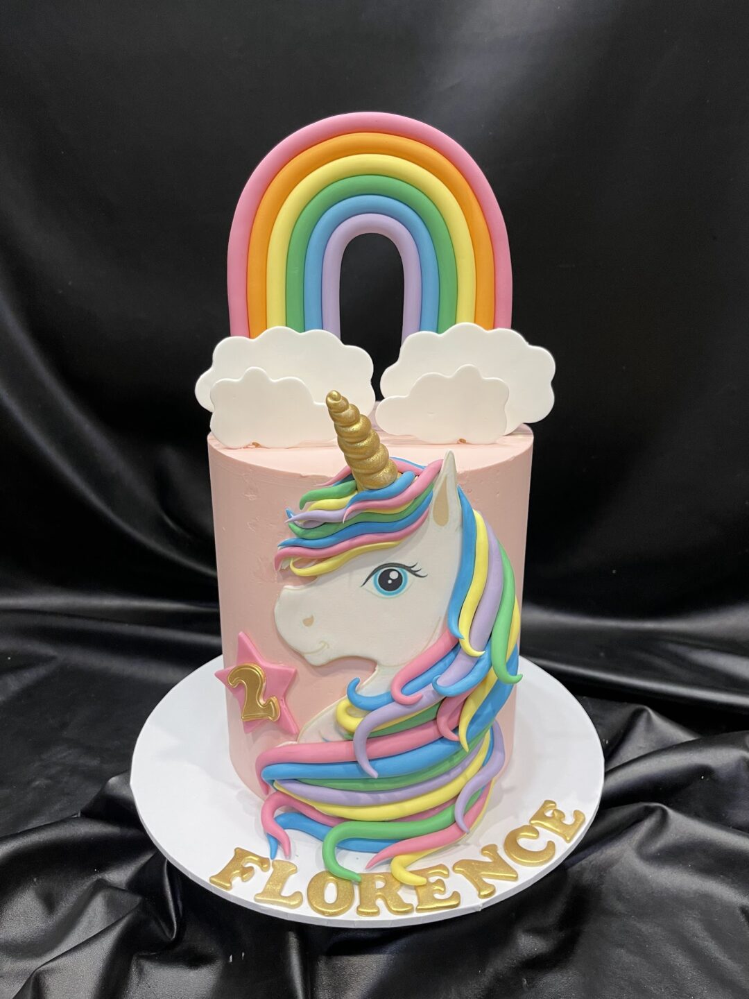 Double height cake with rainbow mane unicorn and rainbow topper. Name and age in gold cutout letters. Please let us know name and age in Order Notes at Checkout, or in Writing.