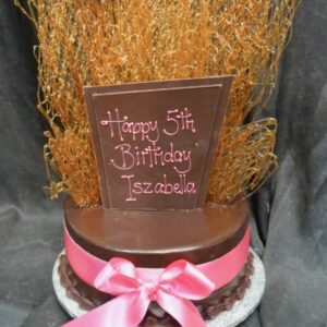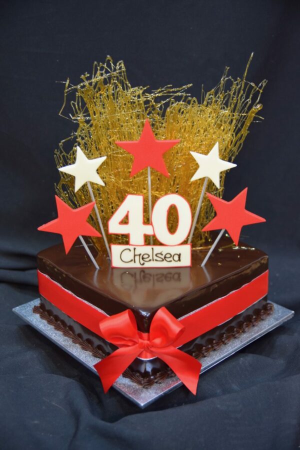 Coloured and white stars and matching coloured chocolate number with name plate with golden toffee shards and matching ribbon. *must be collected on the day of serving – toffee will not keep overnight.