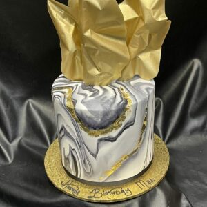Extended height, finished with smooth buttercream, hand-made icing horn, ears and eyes and gold lustred mane.