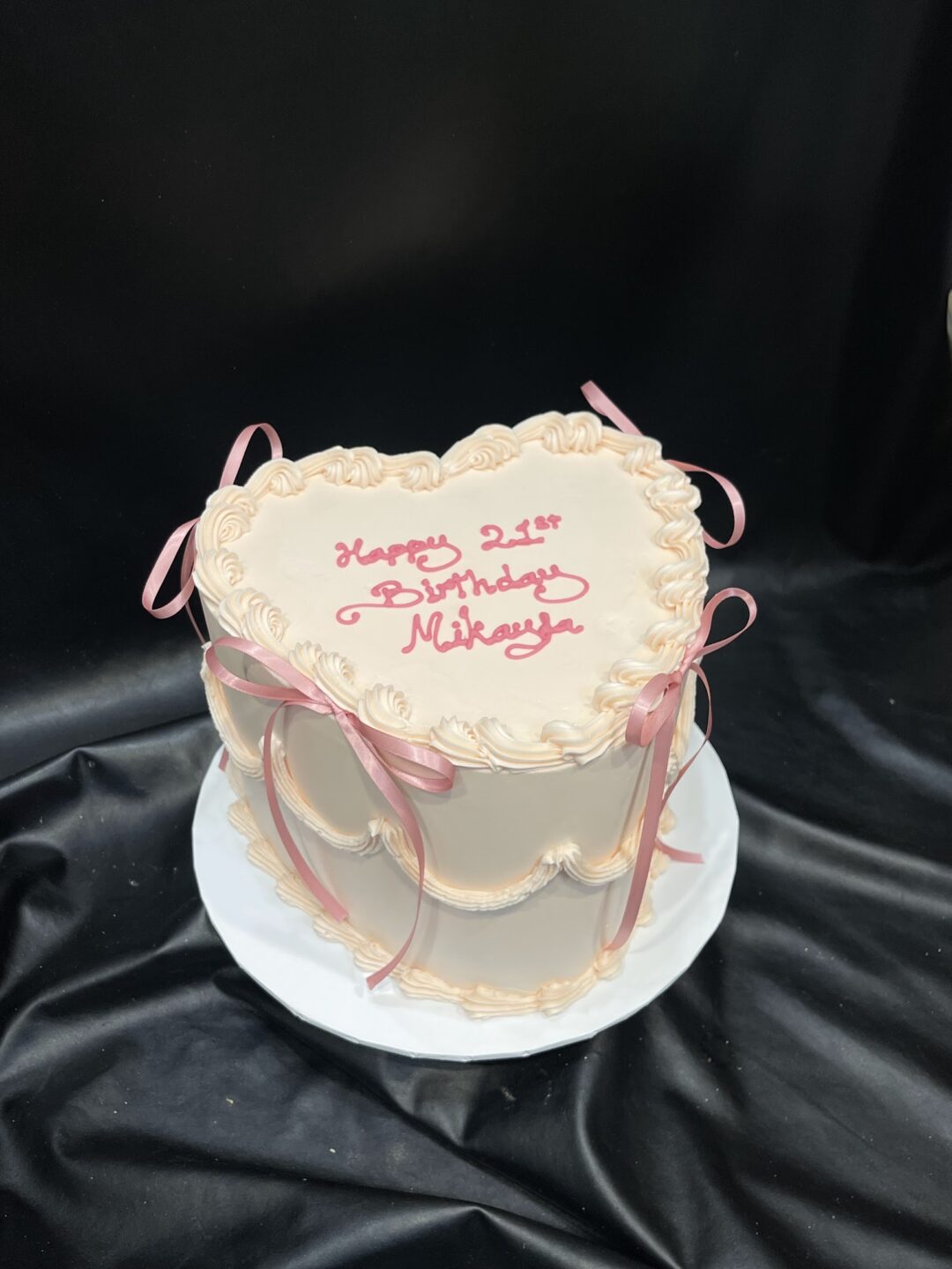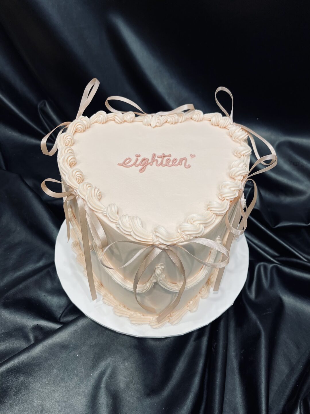 Pale pink vintage buttercream with black satin ribbon bows. *Ribbon colour can be changed – please comment at checkout.