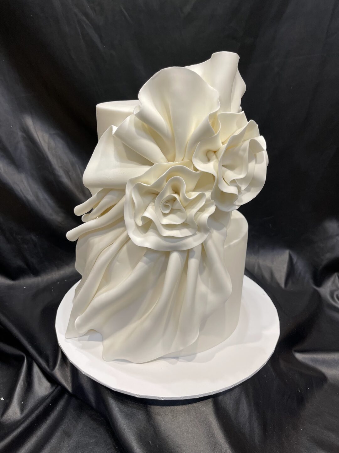 Extended height 2-tier cake with white fondant fantasy flowers and draping.